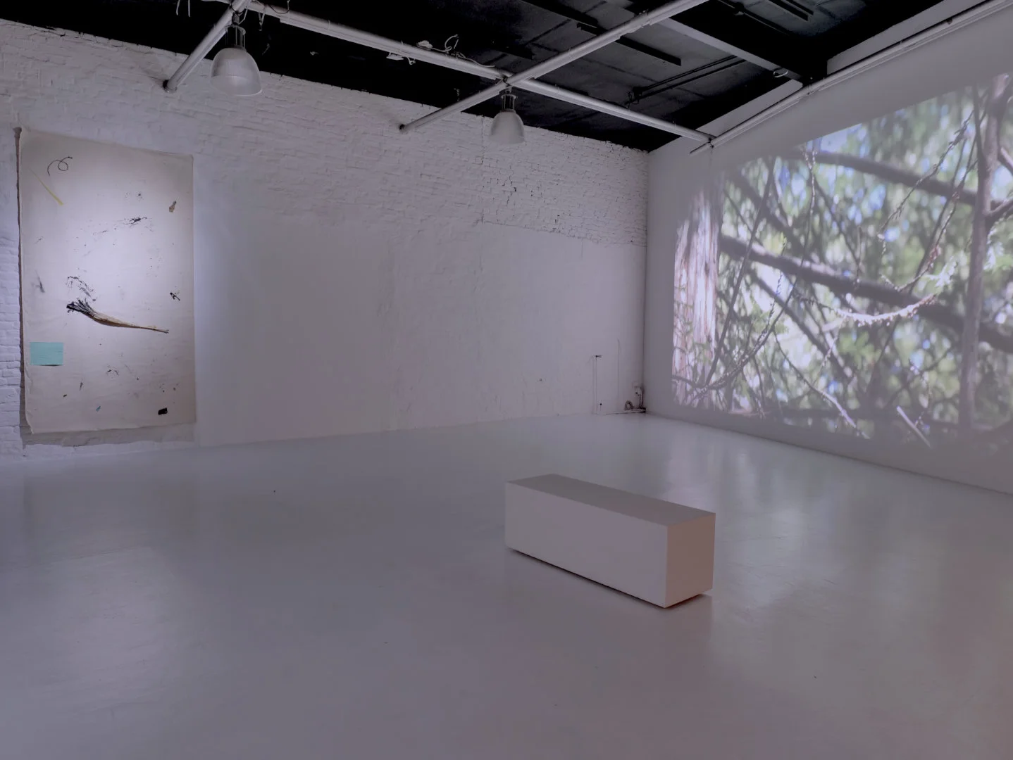 “MOTHER-BURN” is the second video of a trilogy by the artist-couple Asef‑Burckhardt. It was filmed on-site in the burned remains of a redwood tree grove in the ecologically avant‑garde architecture project “The Sea Ranch” in Northern California. Based on extensive periods of research there, Asef‑Burckhardt present their videos, drawings, paintings, performances, sound pieces, photographs and poems created on site and in Berlin. Consisting of multimedia works, their project is continuously expanding and shown in changing settings at international exhibition venues.