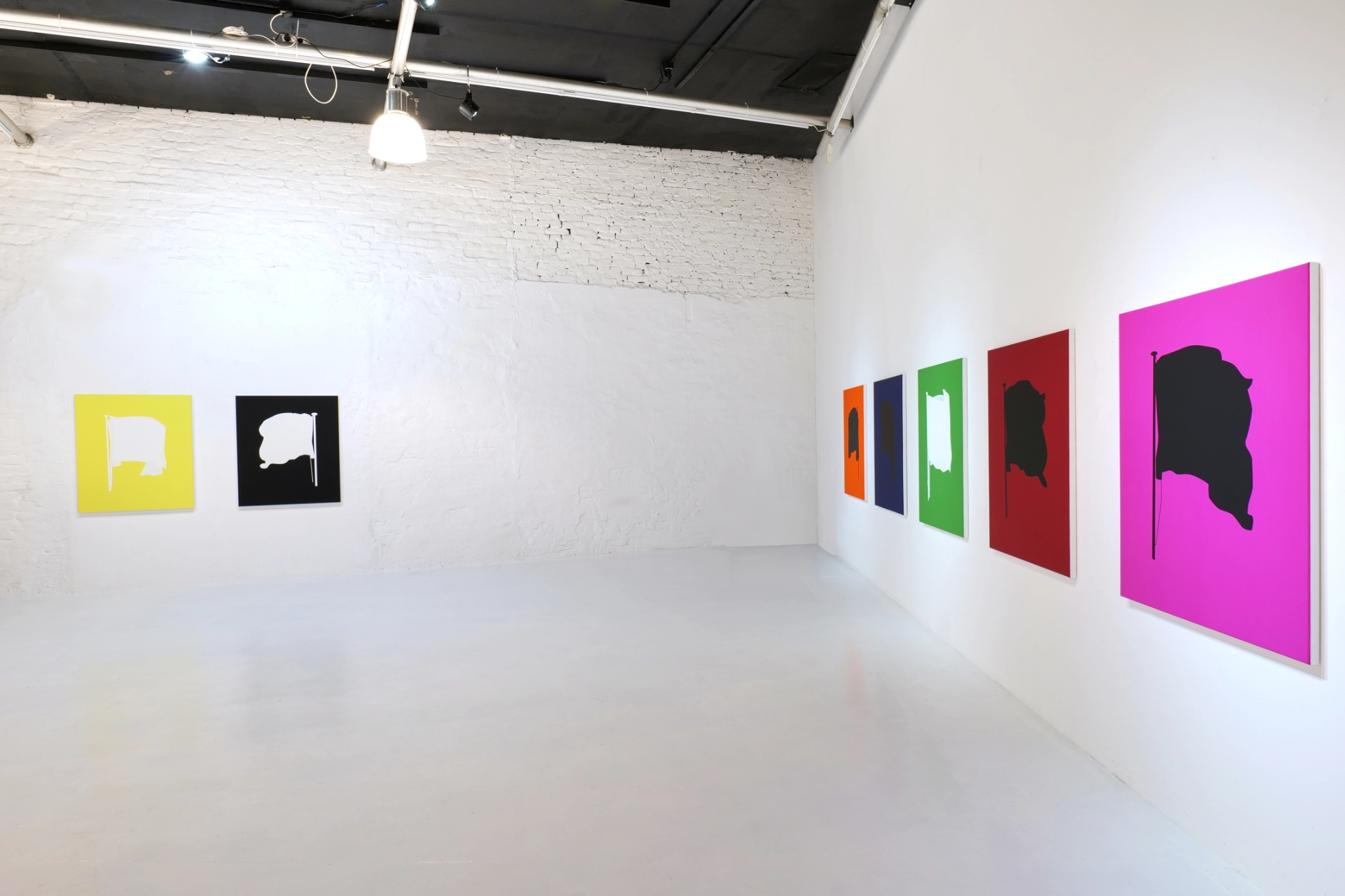 Su nueva serie What is a Flag? (2025) marca una evolución decisiva en el uso del collage por parte de Libeskind. Aunque el principio de ensamblaje permanece, el acto de superponer se traduce aquí en la creación de superficies claras y definidas con precisión. Inspiradas en una publicación alemana de 1934 sobre las llamadas “banderas no europeas”, estas obras están realizadas en pigmento serigráfico sobre lienzo, reduciendo la bandera a su forma más elemental: contornos y siluetas que conservan su carga histórica, pero que aparecen ahora abstractas y renovadas.