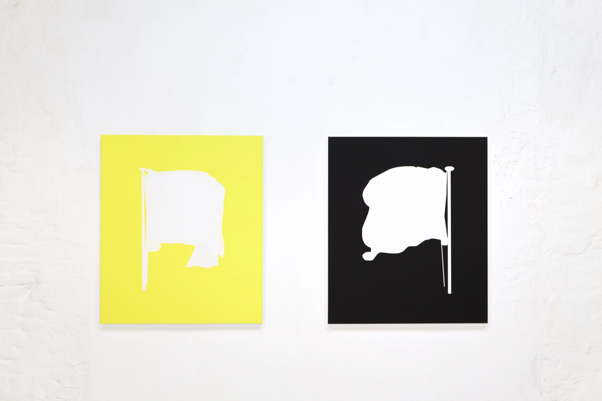 Her new series What is a Flag? (2025) marks a decisive evolution in Libeskind’s use of collage. While the principle of assemblage remains, the act of layering has been translated into the creation of clear, precisely defined surfaces. Inspired by a 1934 German publication of so-called “non-European” flags, these works are executed in silkscreen pigment on stretched canvas, reducing the flag to its most elemental form — skeletal outlines and contours that retain their historical charge yet appear newly abstracted.