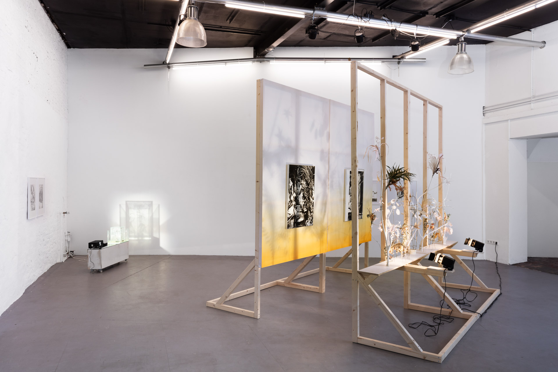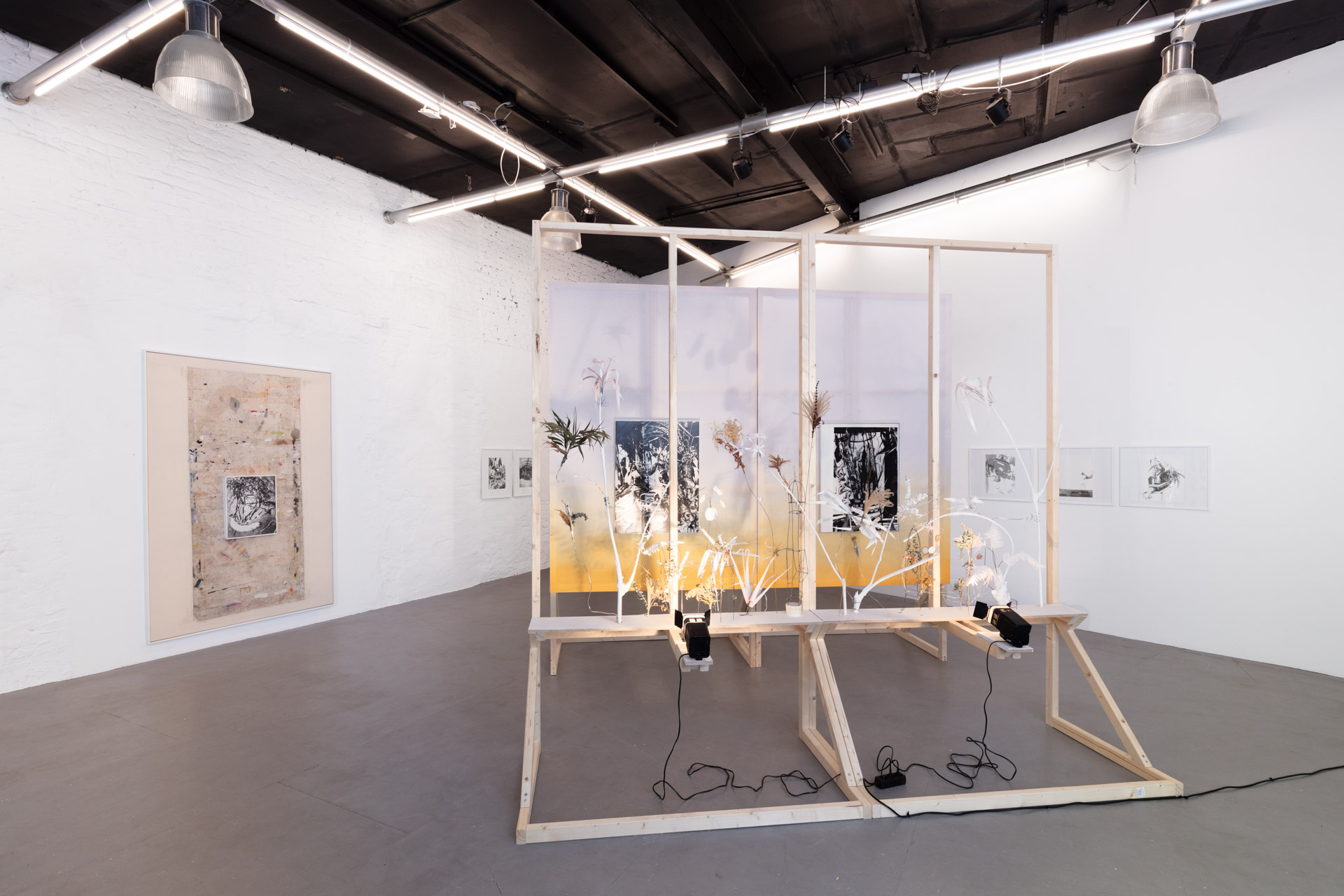 In the middle of the room is a stage on which a plant world installed in front of projectors casts its shadows on two pieces, forming a path along which the spectator, passing by and illuminated, becomes part of the work. He changes it by looking at the still lifes, which are made up of images that we recognize.
