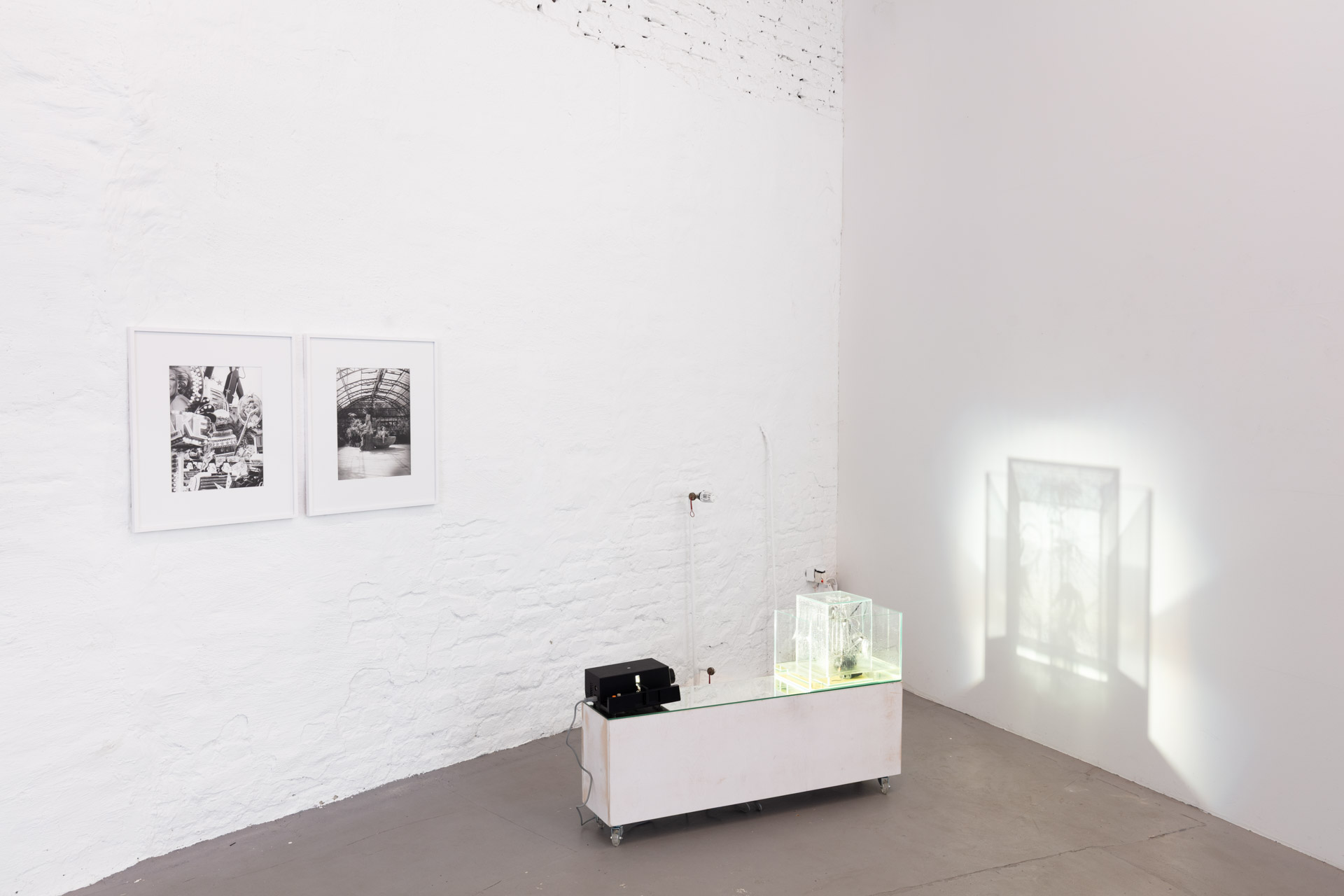 An aquarium refers to the baroque fountain of the Palermo botanical garden, which dialogues with the painted surface of a mechanical amusement park of a funfair, while a slide projector does not illuminate an image, but the reflections of the water and the glass of the aquarium. The moments of recreation that run through human life have not changed over the centuries.